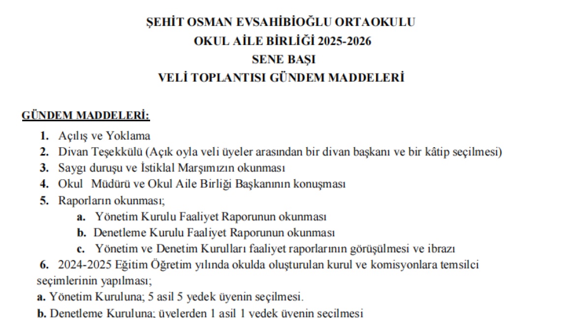 VELİ VE OKUL AİLE BİRLİĞİ TOPLANTISI5 Ekim 2025 tarihi Pazar günü Saat 11.00 de 2025-2026 Eğitim Öğretim...
